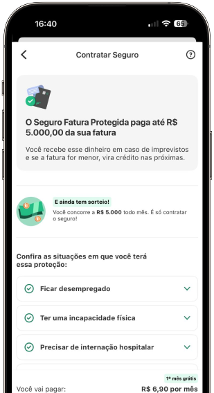- Cobertura para morte ou invalidez por acidente de até R$ 5.000;